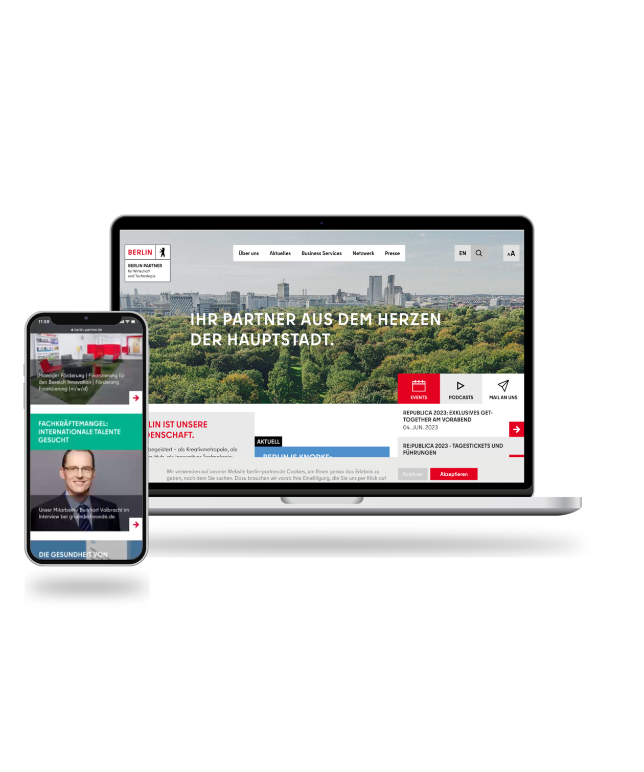 Ganz nach dem Motto “So modern wie Berlin, nur aufgeräumter” findet man dort jetzt alles, was man sucht. Und noch viel mehr. Zum Beispiel: Aktuelle Beiträge zu Trendthemen, Podcasts, Events, Business Services und und und. Alles responsive und SEO-optimiert, versteht sich.