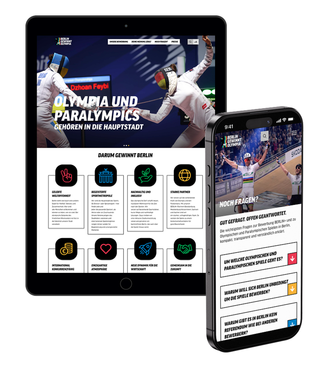 Berlin bewirbt sich um die Olympischen und Paralympischen Spiele – mit einer Vision, die weit über den Sport hinausgeht. Für die offizielle Website der Bewerbung haben wir eine digitale Plattform entwickelt, die Haltung zeigt: weltoffen, nachhaltig und nah an den Menschen. Die Seite transportiert die Idee einer Stadt, die Sport als verbindende Kraft versteht – und macht die Bewerbung für Bürger:innen, Politik, Medien und internationale Stakeholder gleichermaßen erlebbar.